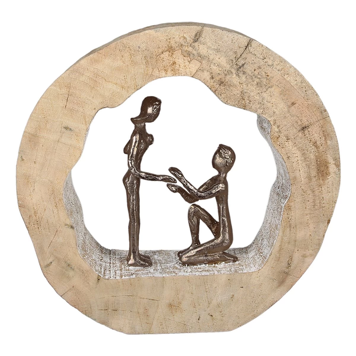 Zwei bronzefarbene Figuren in einer massiven Mango-Holzscheibe