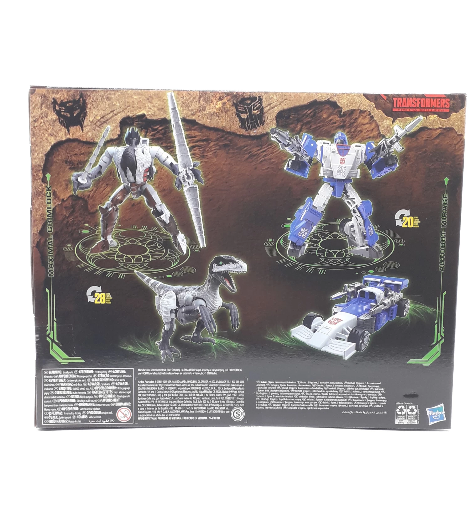 Die von G1 inspirierte Autobot Mirage Figur kann in 20 Schritten in einen Rennwagen und die durch Beast-Wars: Uprising inspirierte Maximal Grimlock Figur in 28 Schritten in einen Raptor verwandelt werden.