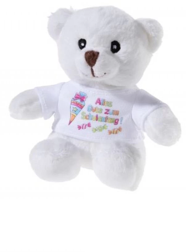 BÄR Schulanfang klein, aus weichen Synthetikmaterial, mit weissem T-Shirt und Druck „Alles Gute zum Schulanfang“ weichgefüllt.